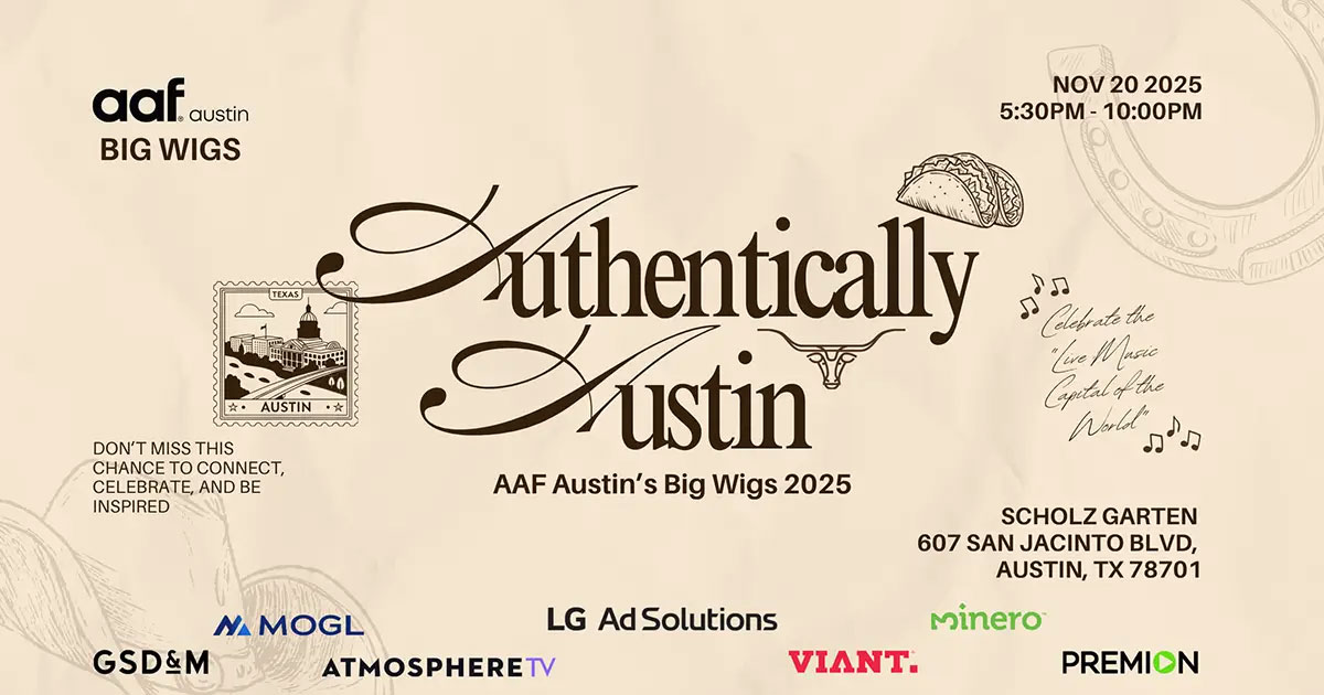 This year’s event celebrates everything that makes Austin one of a kind — bold ideas, local flavor, and the creative spirit that runs deep in our city. We’ll honor the advertising legends who helped shape our community while spotlighting the rising stars who embody Austin’s next wave of innovation and originality.